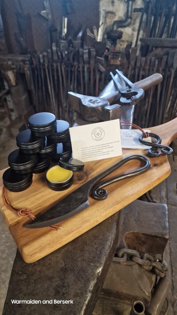 Damit deine handgeschmiedeten Schätze lange scharf und rostfrei bleiben, haben wir die Eisen-Butter entwickelt. Unsere 100% natürliche Pflege aus Bienenwachs und Leinöl versiegelt Stahl und Holz lebensmittelecht.