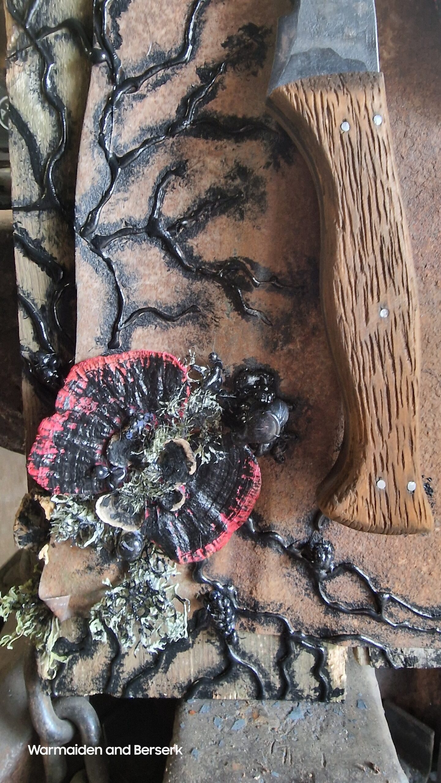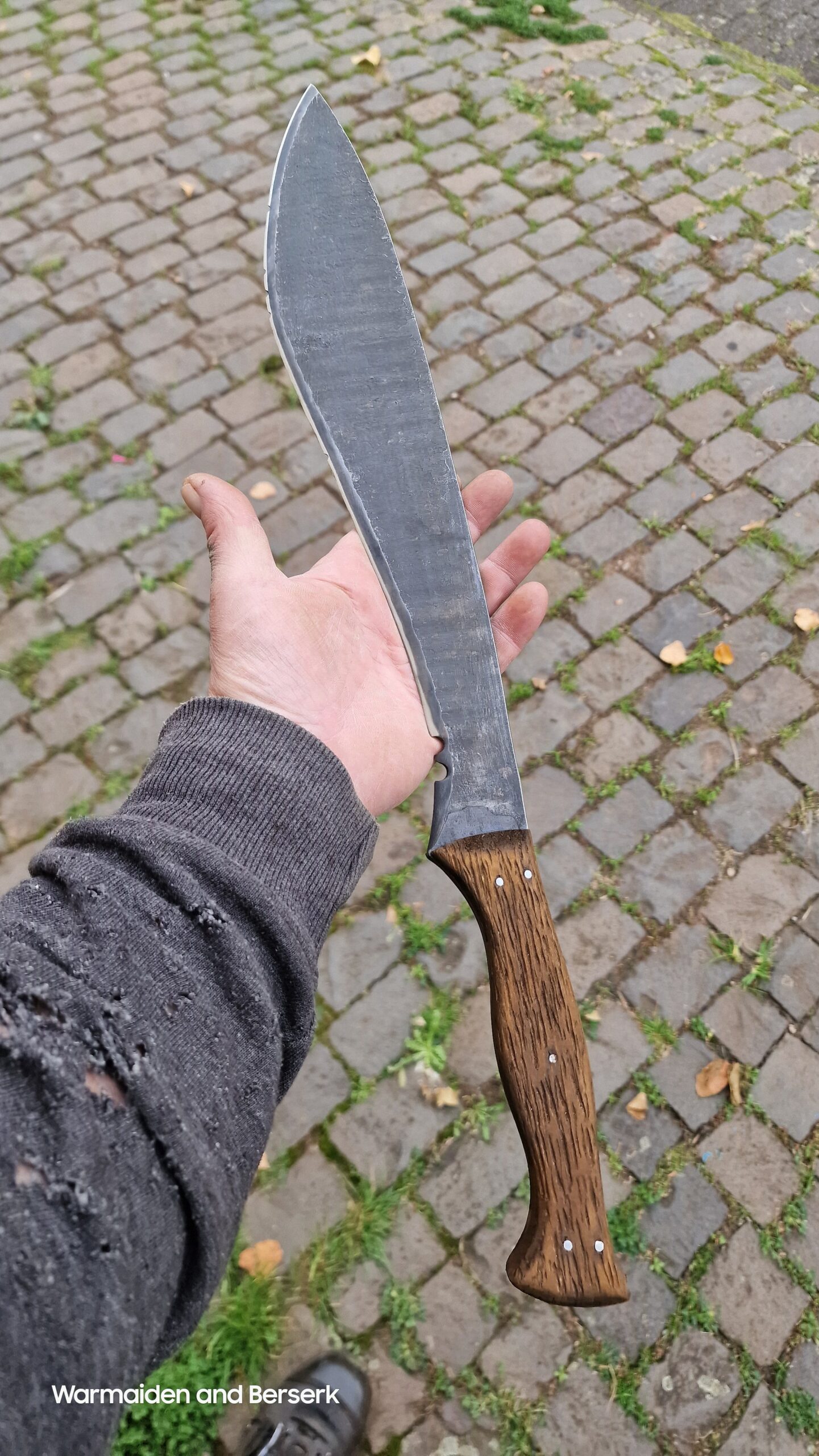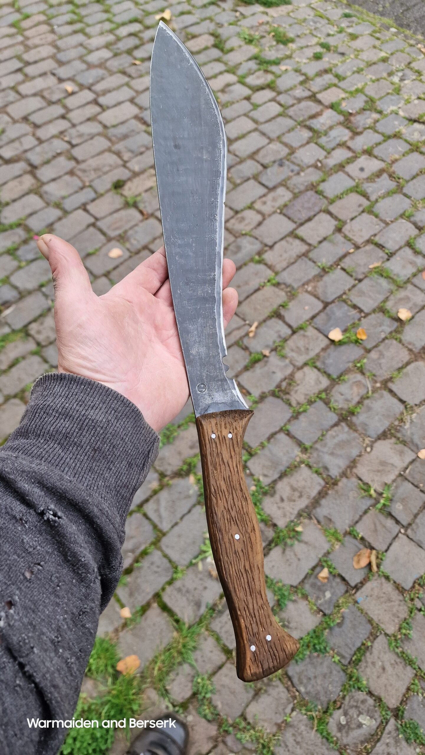 Es trägt Spuren von Feuer und Zeit – jede Unebenheit erzählt von Entstehung und Überleben. Der Griff aus fest umwickeltem Leder verleiht ihm einen authentischen, gelebten Charakter.