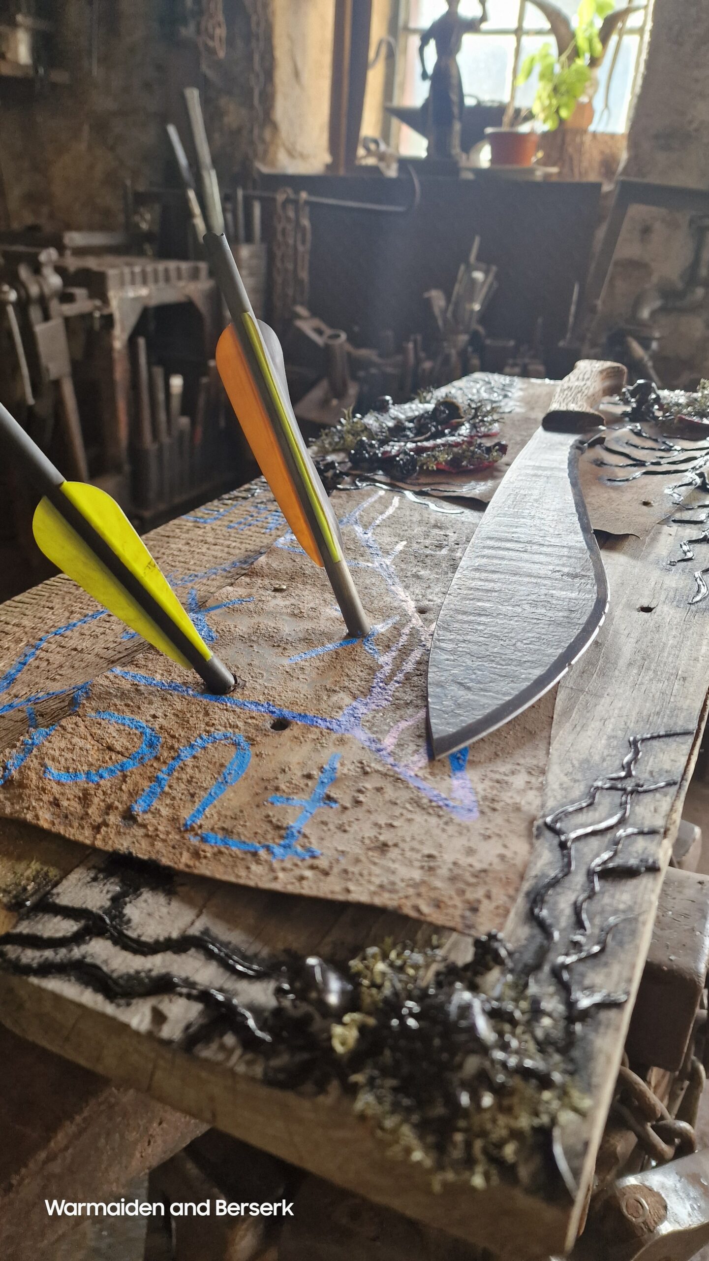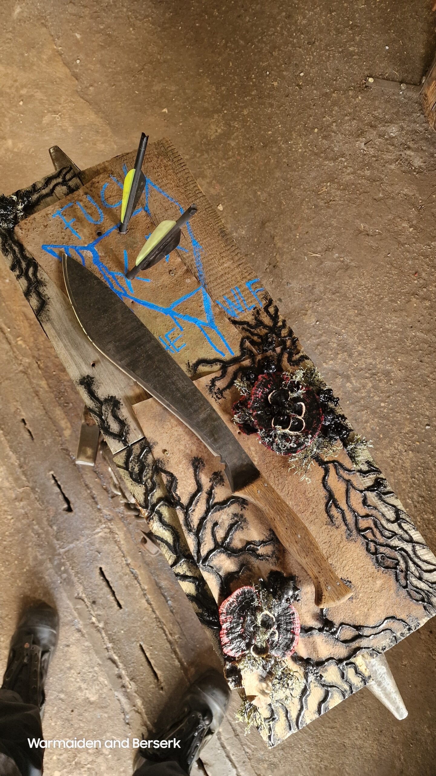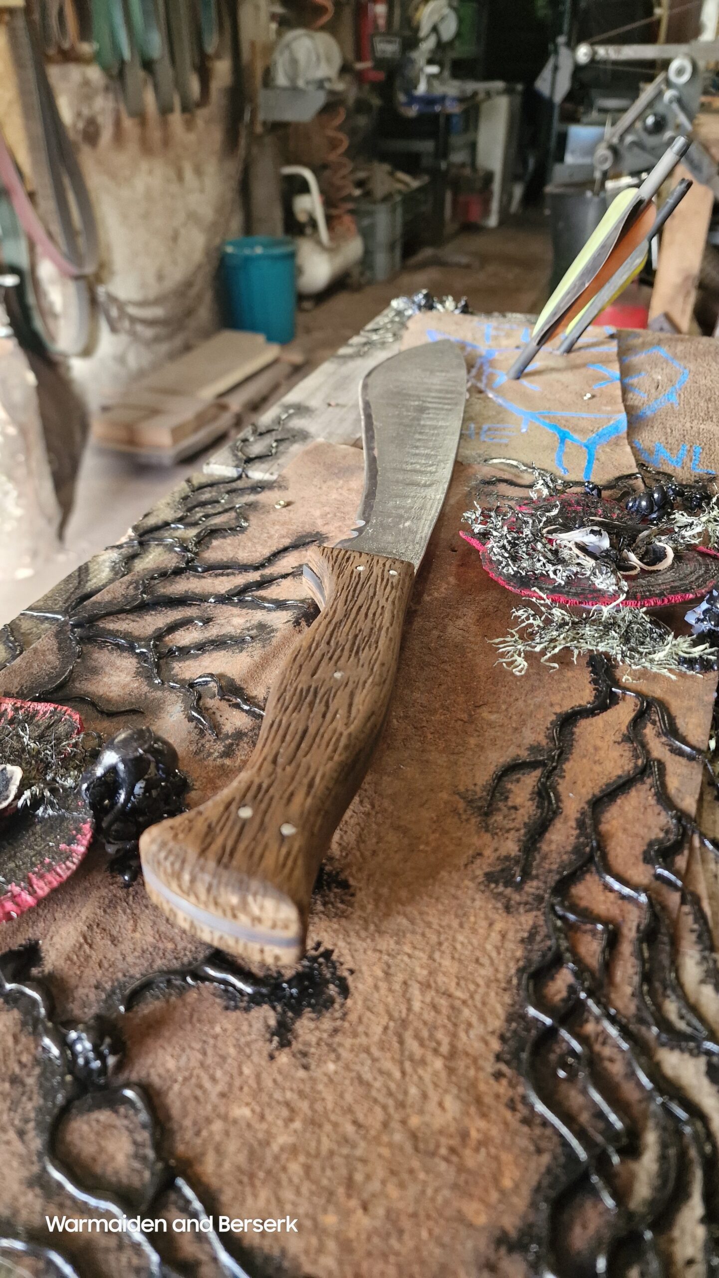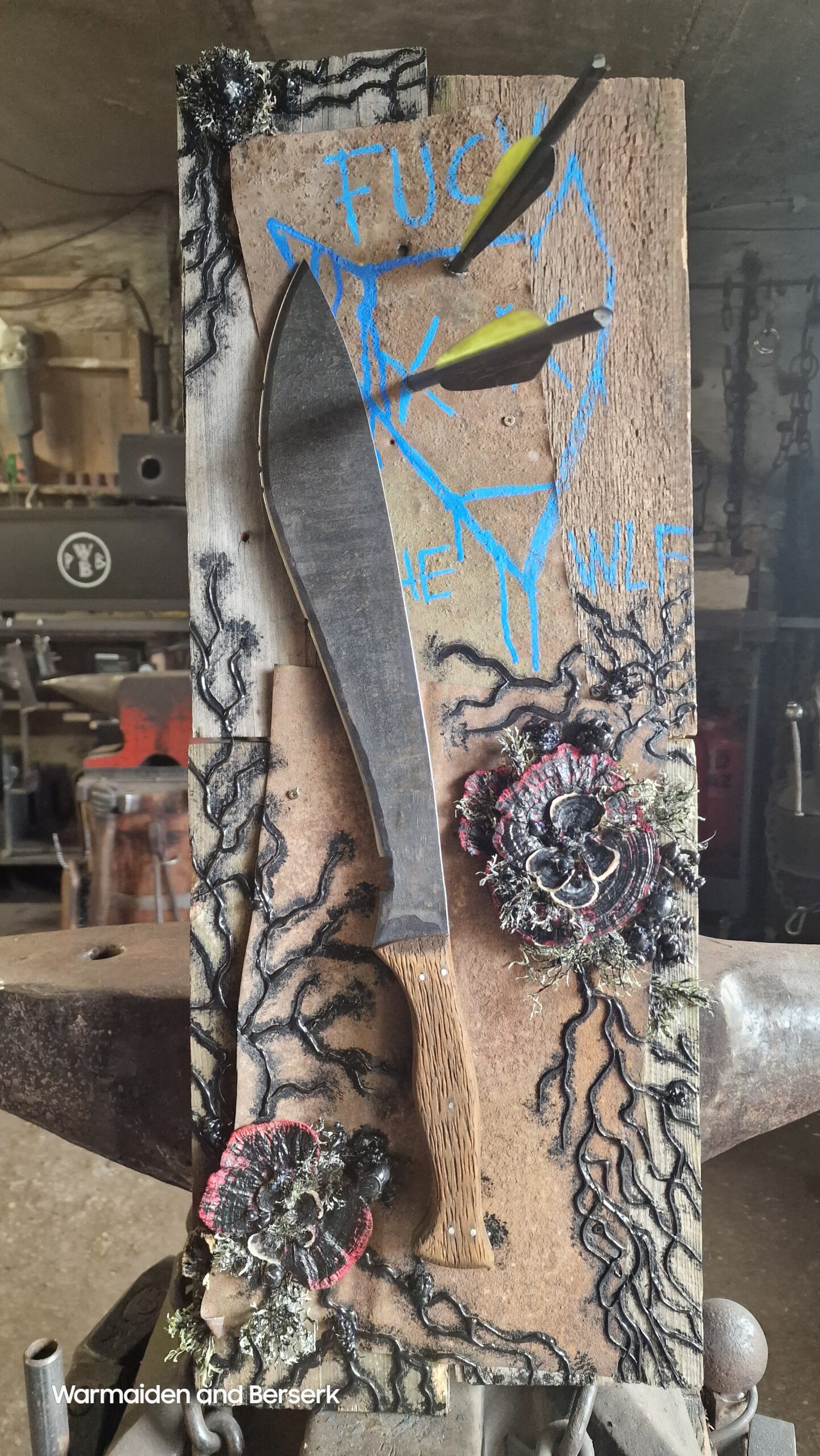 Diese handgeschmiedete Stück aus L2 Stahl ruht auf einem Display aus rostigem Blech, gehalten von verborgenen Magneten. Das verblasste Symbol erzählt von verlorener Hoffnung und erinnert an Abenteuer in einer rauen, post-apokalyptischen Welt.