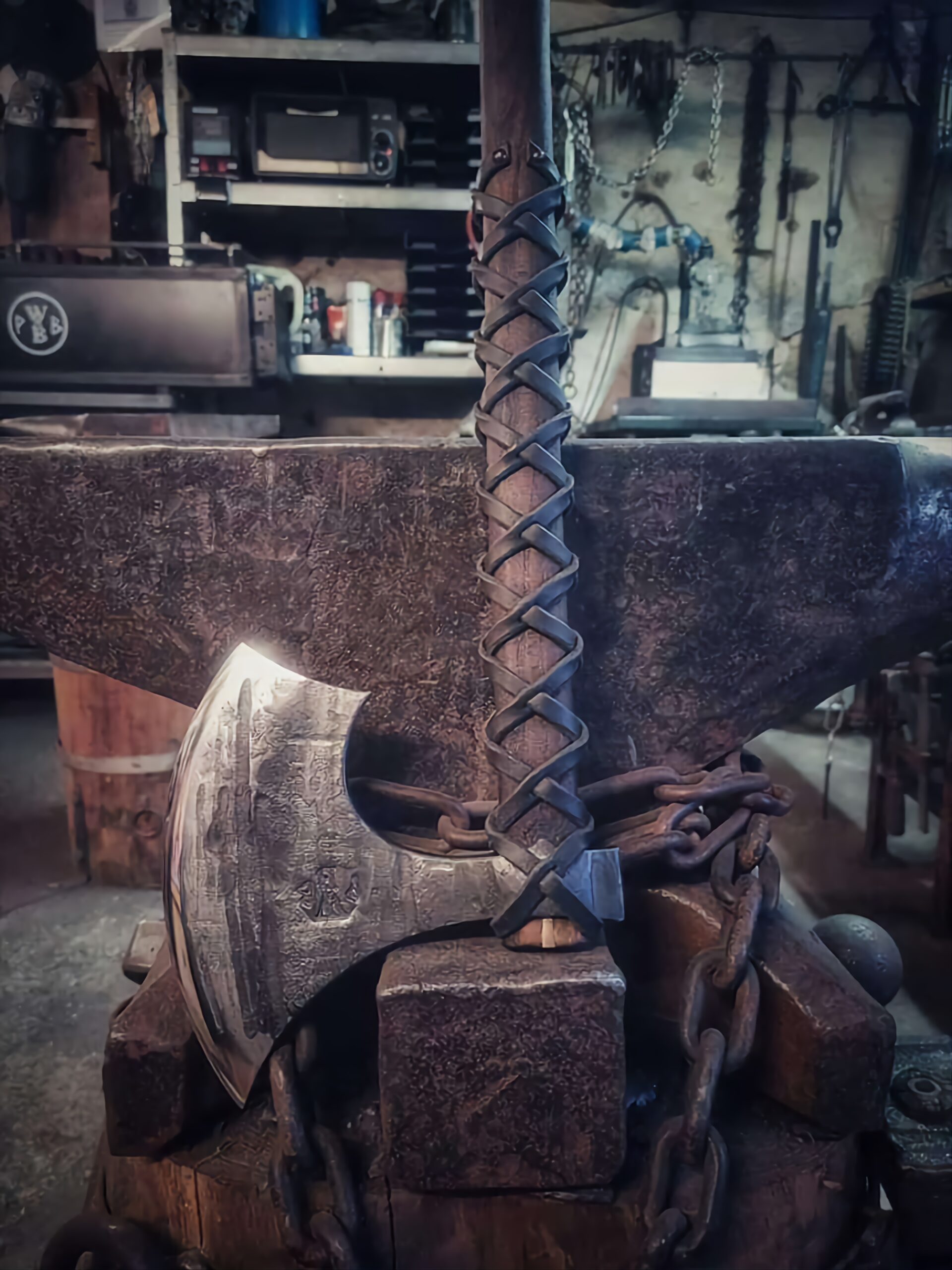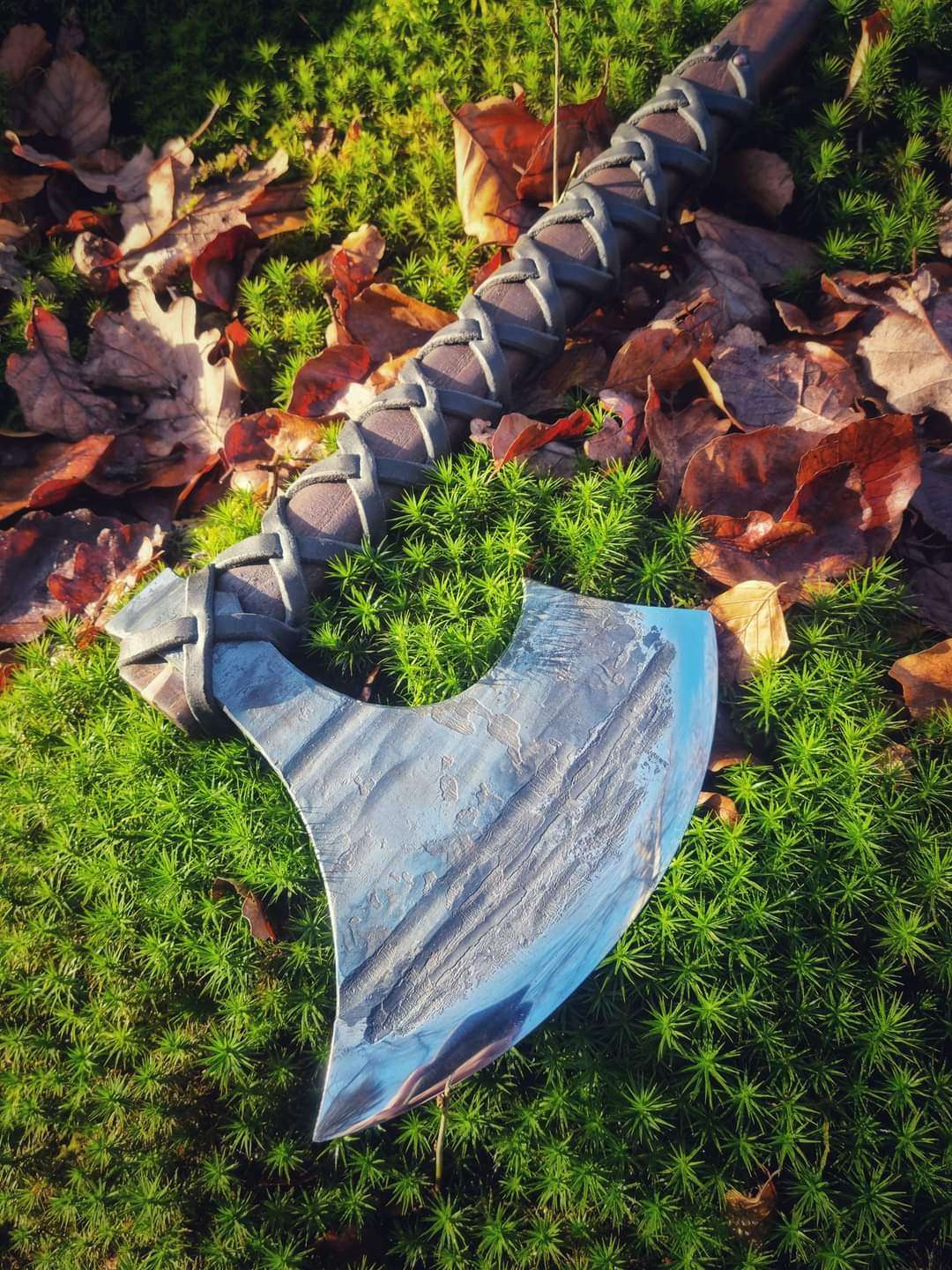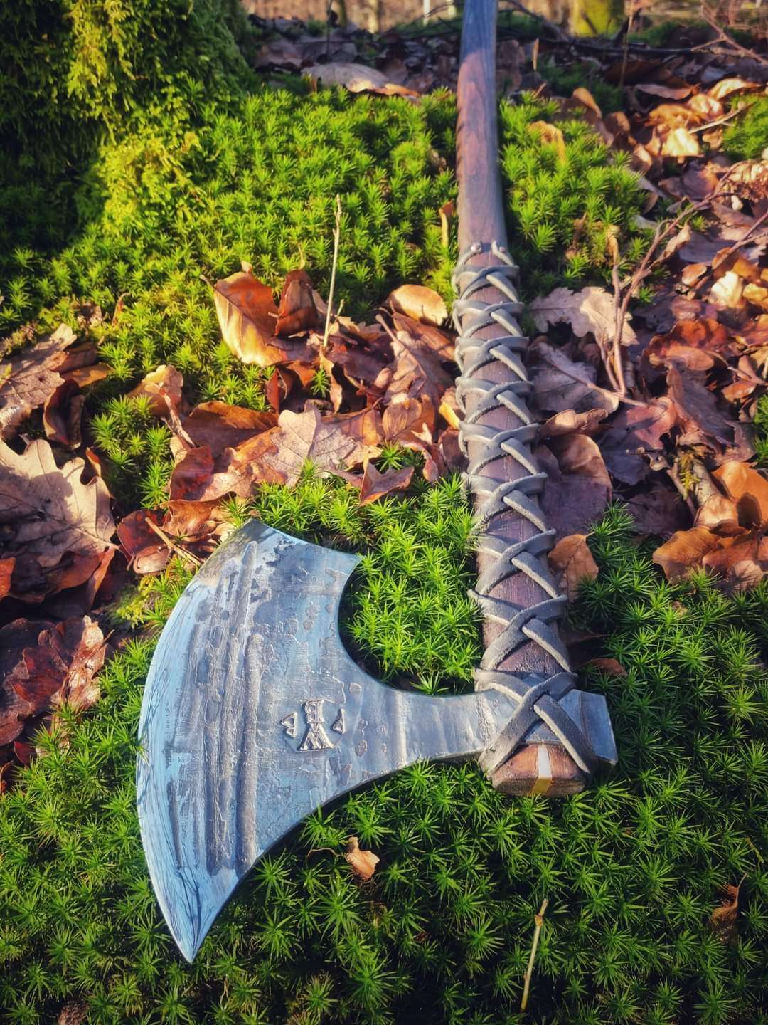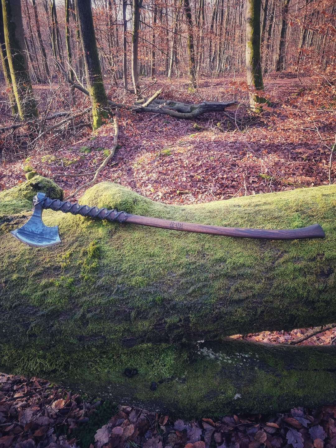 Dieses massive Sammlerstück „Berserker“ wird aus Karbonstahl handgeschmiedet. Der Schaft besteht aus robustem Eschenholz. Aufwendig graviert sind die altnordischen Worte „Áræði – Mut“ und „Styrkr – Stärke“ in Rök-Runen, die dem Stück eine mythische Aura verleihen.