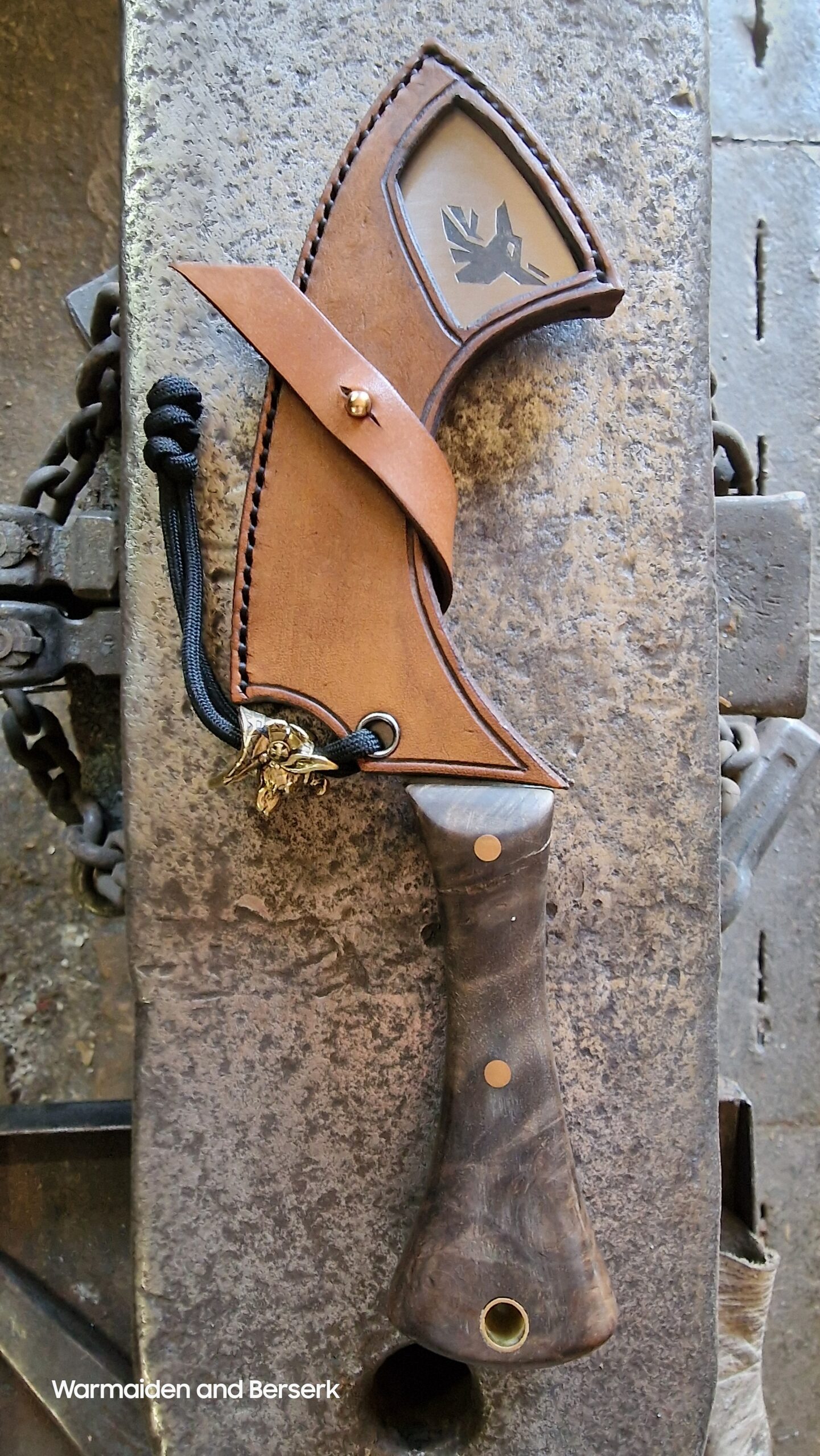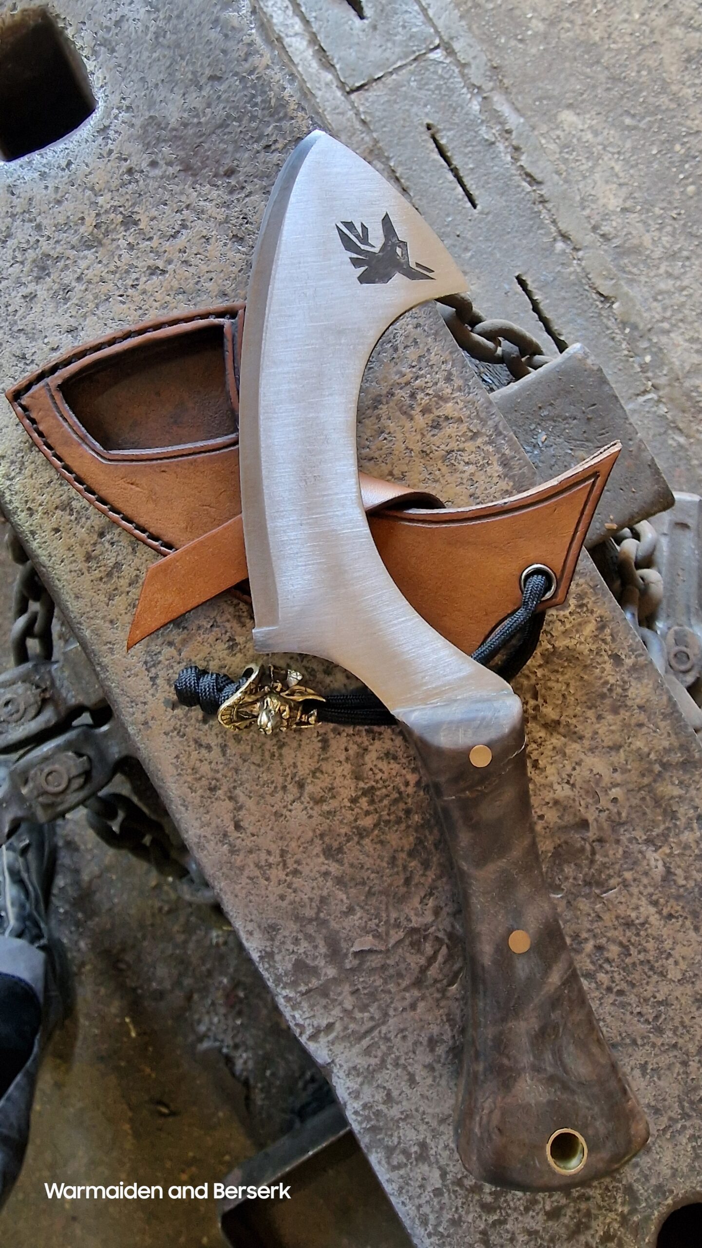 Dieses außergewöhnliche Stück wurde aus einem einzigen Stück L2-Stahl geschmiedet und vereint traditionelle Handwerkskunst mit einem eleganten, von ägyptischer Mythologie inspirierten Design. Der Griff besteht aus stabilisierter türkischer Walnusswurzel und überzeugt durch seine natürliche Maserung und Haptik.